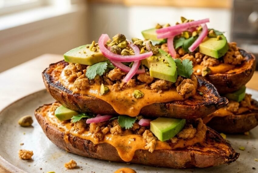It's time to build! Place a roasted sweet potato half on a plate, cut-side up. Generously spoon over the creamy chipotle sauce, followed by a hearty portion of the spicy chicken. Finish with your favorite toppings—avocado, cilantro, pickled onions, and a final crunchy element. Add an extra drizzle of sauce for good measure!